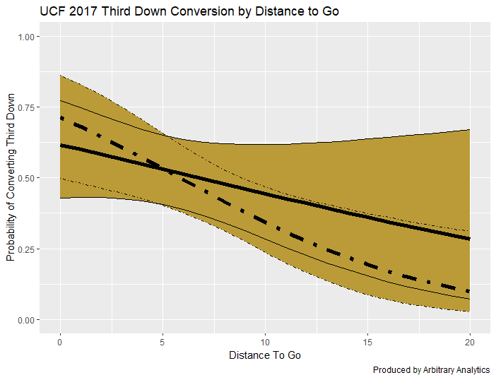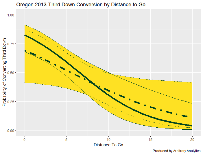 I modeled the third down success for each of Frost’s three Oregon teams where he was the offensive coordinator as well as each of the three teams he was the head coach. For each chart, the solid line represents the probability of converting a third down running the ball whereas the dashed line represents throwing the ball.